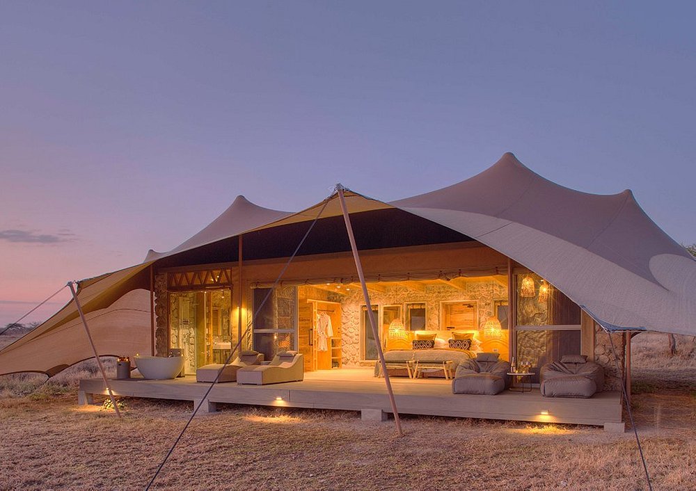 Ten stylish tented suites and one family suite overlook the expansive plains of the eastern Serengeti. The beautifully furnished interiors are spacious and comfortable, with sliding doors running the width of the room, opening onto an expansive viewing deck. The walls are made from calcrete, a sedimentary rock created from the ashes of the Ngorongoro volcanoes, that helps to regulate the temperatures of the suites. The suite interiors are decorated in natural materials and tones. Each bathroom enjoys a view over the plains and has a standalone resin tub on the private deck, allowing for an al fresco bubble bath with a chilled glass of fizz